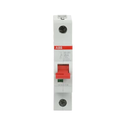 SD201/25 — однополюсный модульный рубильник с красным рычагом от компании ABB, предназначенный для коммутации электрических цепей.